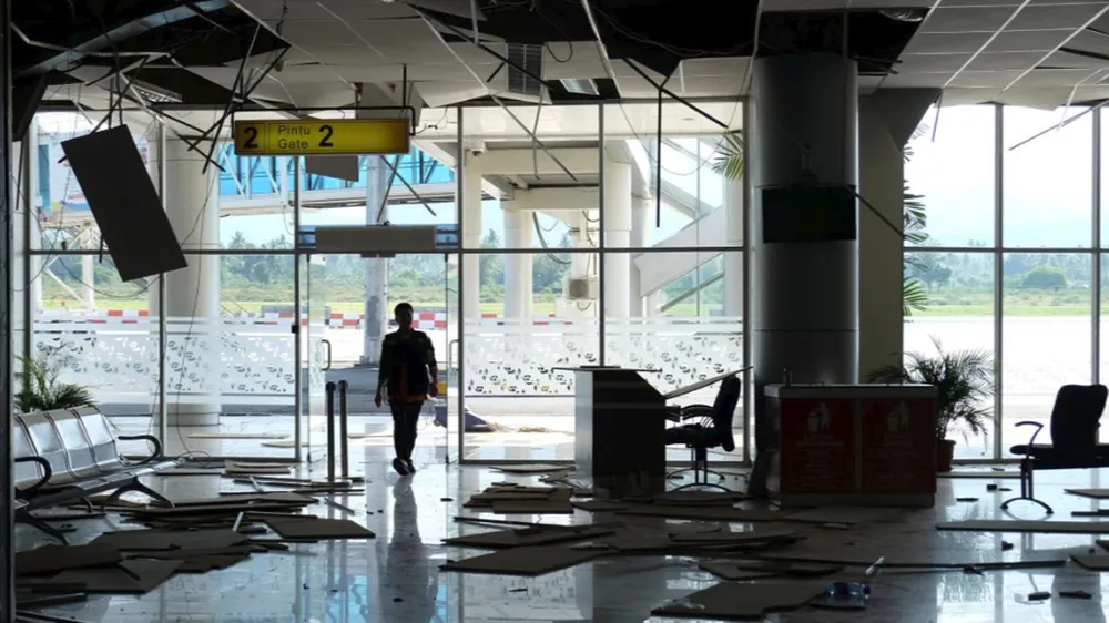 Một người đàn ông đi bên trong sân bay sau trận động đất ở Palu. Ảnh: EPA-EFE