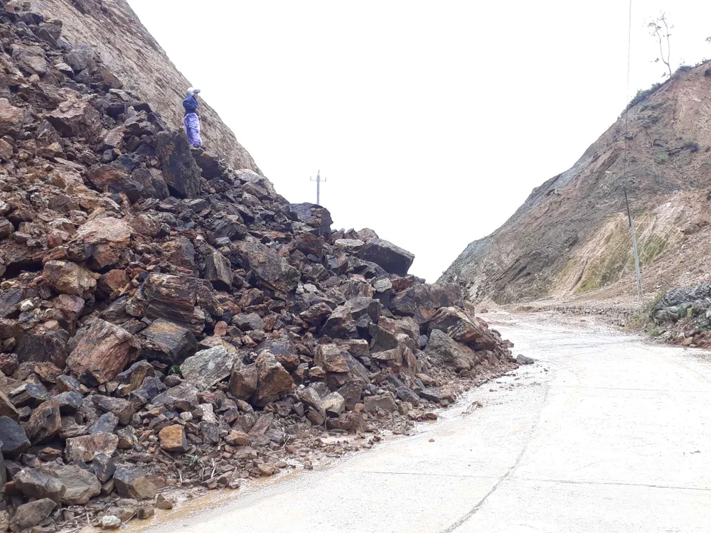Đá từ trên vách núi tràn xuống đường và có dấu hiệu sạt lở rộng thêm