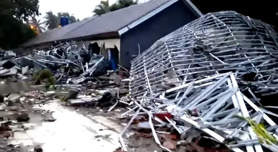 Nhà cửa ở Pandeglang, Banten, Indonesia sụp đổ do sóng thần gây ra tối 22-12-2018 . Ảnh cắt từ clip trên The Jakarta Post