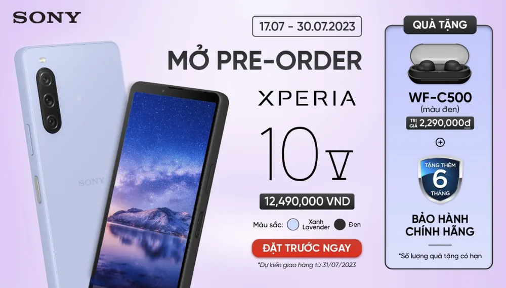 Xperia 10 V gồm hai màu đen và tím lavender sẽ được bán tại Việt Nam từ ngày 31-7-2023 với giá niêm yết 12.990.000 đồng. Đặc biệt, khi đặt trước Xperia 10 V khách hàng sẽ được tặng kèm tai nghe chống ồn WF-C500 màu đen từ ngày 16-7 đến hết 30-7-2023.