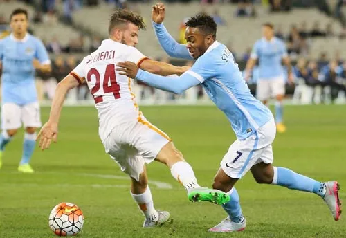 Sterling (phải) đi bóng trong trận giao hữu với AS Roma.