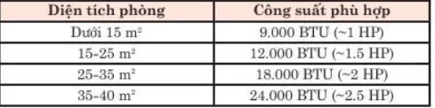 - Chọn điều hòa không khí có công suất phù hợp với nhu cầu sử dụng của gia đình. Công suất của máy phụ thuộc vào diện tích, độ kín của phòng: