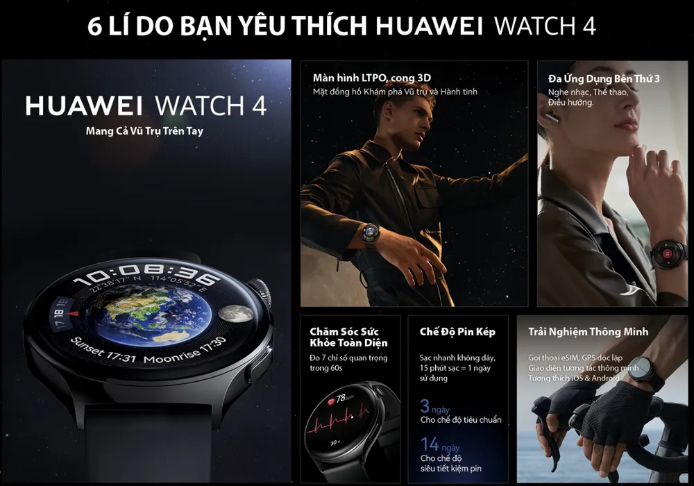 Đây là dòng đồng hồ thông minh cao cấp có tích hợp eSIM mới nhất của HUAWEI, sở hữu thiết kế sang trọng, đậm chất tương lai, tương thích với cả hai hệ điều hành iOS và Android. HUAWEI WATCH 4 sở hữu thiết kế lấy cảm hứng từ chuyến đi khám phá không gian. Vỏ thiết bị được làm bằng thép không gỉ 316L, mặt kính cong 3D và giao diện mặt đồng hồ hành tinh ngoạn mục, mang đến trải nghiệm không gian rộng lớn.