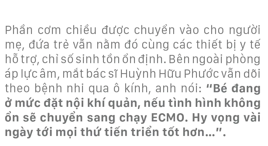 Chúng tôi bước vào Bệnh viện Nhi đồng Thành phố, mặc dù bệnh viện có trang thiết bị y tế hiện đại, sẽ hỗ trợ tối đa cho bệnh nhi, nhưng điều đó cũng không át được cảm giác lo lắng của chúng tôi. Vì khu vực điều trị này dành cho những ca trẻ em mắc Covid-19 chuyển nặng, có em chỉ hơn 3 tháng tuổi nhưng bệnh tim bẩm sinh cộng với mắc Covid-19, giường bệnh của em xung quanh toàn máy móc y tế hỗ trợ để giữ từng nhịp thở trong lồng ngực nhỏ xíu…