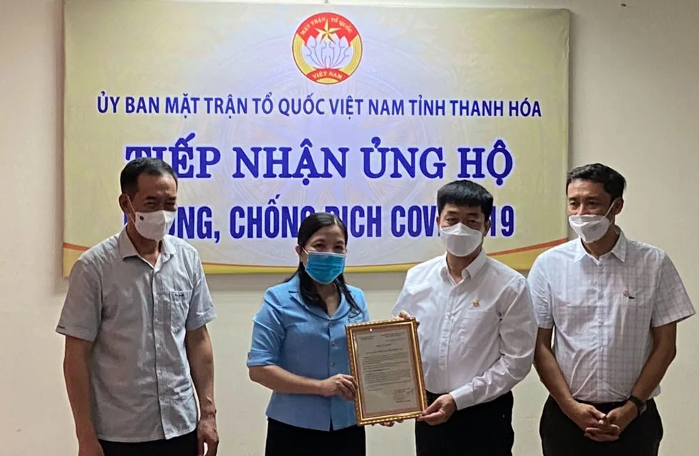 Đại diện Quỹ phòng chống dịch Covid-19, bà Phạm Thị Thanh Thủy, Chủ tịch Ủy ban Mặt trận Tổ quốc Việt Nam tỉnh Thanh Hóa bày tỏ sự trân trọng trước những hành động thiết thực của doanh nghiệp, tổ chức chung sức cùng Thanh Hóa quyết tâm đẩy lùi dịch bệnh. Bà Thủy mong thời gian tới sẽ tiếp tục có nhiều hơn nữa những tấm lòng chung tay ủng hộ để có thêm nguồn lực mua vaccine và các trang thiết bị y tế cần thiết phục vụ công tác phòng, chống dịch tại tỉnh nhà.