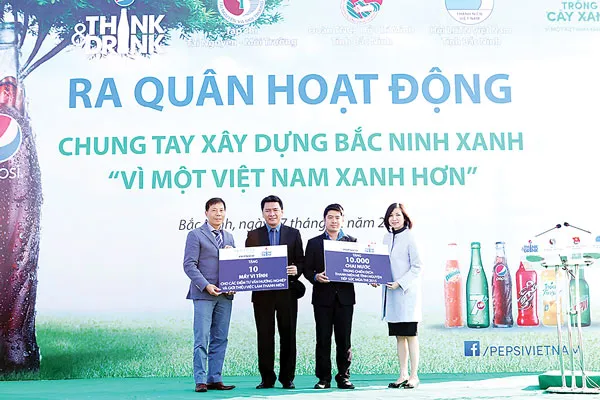 Đại diện Suntory PepsiCo Việt Nam trao tặng 10 máy tính và 10.000 chai nước cho Hội Liên hiệp Thanh niên tỉnh Bắc Ninh trong lễ phát động trồng cây.