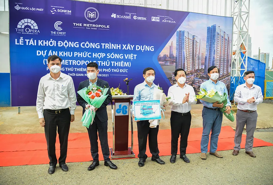 Ông Lê Viết Hải, Chủ tịch HĐQT Tập đoàn Xây dựng Hòa Bình - đại diện các nhà thầu thi công dự án cho biết: Sự kiện này có ý nghĩa quan trọng, đánh dấu một cột mốc mới - tái khởi động xây dựng, bắt đầu cho cuộc sống bình thường mới ở những khu vực an toàn. Từng bước khôi phục hoạt động sản xuất, kinh doanh, tạo việc làm, thu nhập cho người lao độngTrước đó, ngày 21-9 UBND Thành phố Thủ Đức đã có công văn cho phép các công trình xây dựng tại vùng xanh trên địa bàn được chính thức tái khởi động trong điều kiện đáp ứng đủ các tiêu chuẩn phòng, chống dịch covid-19. Trước khi tái khởi động Dự án Khu phức hợp Sóng Việt – The Metropole Thủ Thiêm, đoàn công tác của thành phố cũng đã đi kiểm tra và đánh giá công trình đủ điều kiện tái khởi động.