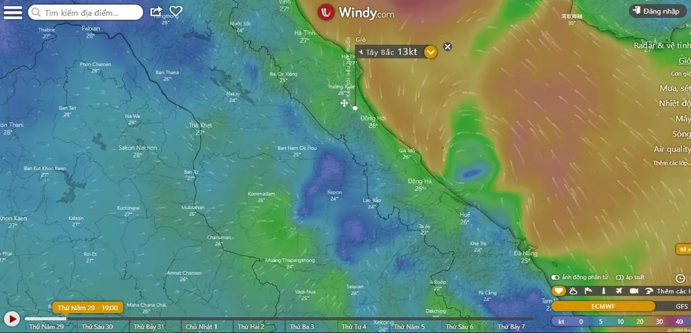 Thế nhưng trên trang Windy.com – một trang dự báo bão uy tín của châu Âu, được nhiều người dân Việt Nam sử dụng để theo dõi bão lại cho thấy vào lúc 18 giờ tối nay, tâm bão số 4 đã áp sát vào bờ biển 2 tỉnh Quảng Bình và Quảng Trị. Theo mô hình này, tâm bão sẽ đi vào Quảng Bình – Quảng Trị vào tối nay 29-8 (thay vì đi vào Nghệ An – Hà Tĩnh vào sáng mai 30-8, như Trung tâm Dự báo khí tượng – thủy văn quốc gia dự báo).