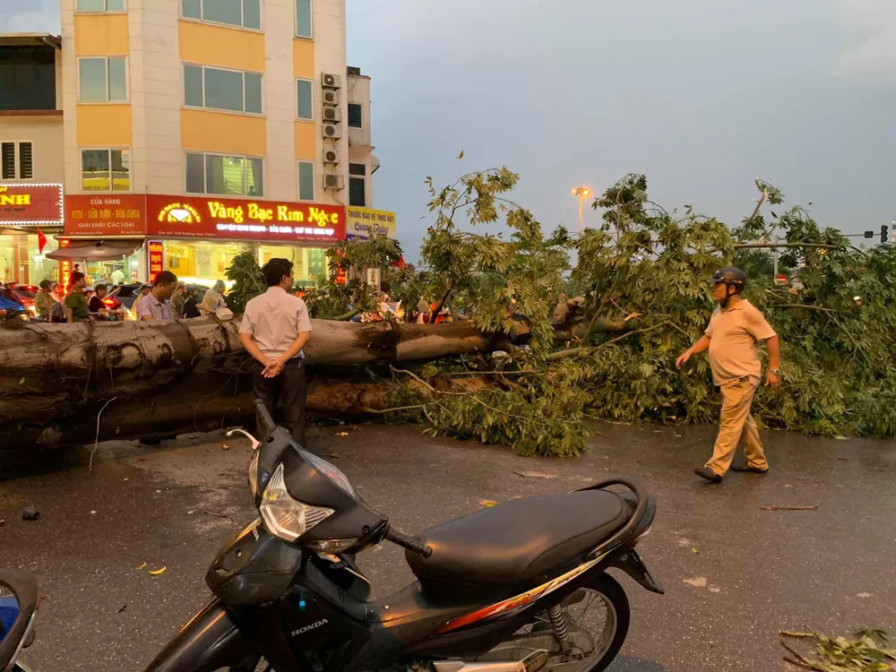 Tại trung tâm Hà Nội, tầm khoảng từ 15 giờ 30 đến tối 29-8, mây đen kéo đến kèm sấm chớp liên tục, đặc biệt là dông, gió xoáy đã quật đổ rất nhiều cây xanh chắn ngang đường, xô ngã xe máy, giật tung nhiều biển quảng cáo, giao thông ách tắc… khiến người dân rất lo lắng khi rời công sở về nhà.