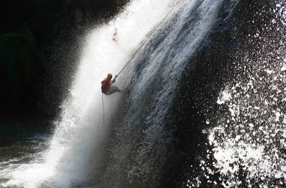 Khoảng 14 giờ cùng ngày sau khi tham gia vượt nhiều đoạn thác trong hành trình, nhóm du khách tiếp tục vượt qua thử thách tại một thác nước khác.