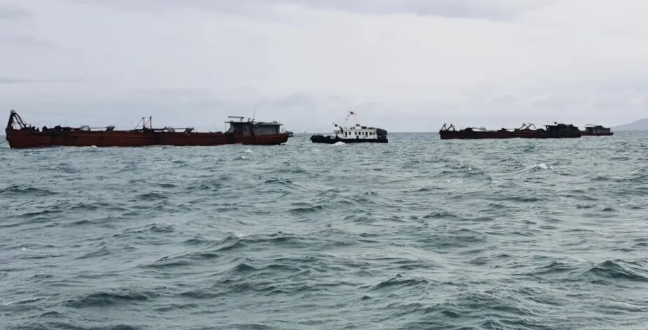 Lực lượng chức năng tiếp cận các sà lan từ vùng biển Campuchia về Việt Nam