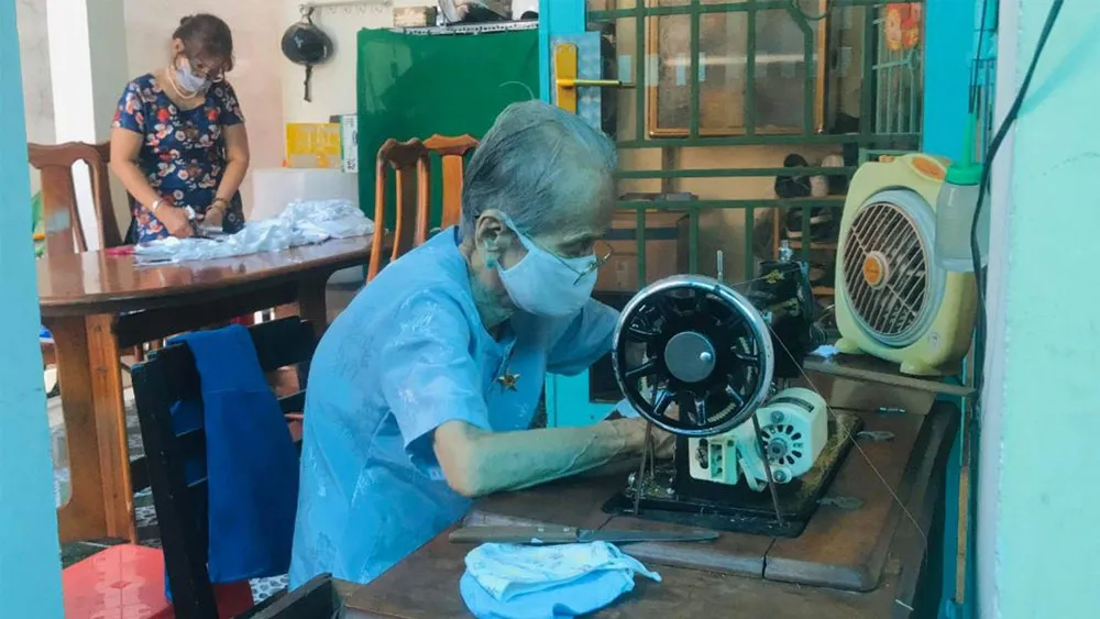 Mẹ Việt Nam anh hùng Ngô Thị Quýt: Già rồi, không giúp được nhiều thì giúp ít. Hồi xưa chiến tranh còn may được quân phục cho bộ đội, chừ cuộc sống tốt hơn rồi, ngồi nhà may vỏ chăn cũng bình thường thôi, có chi mà kể. Rồi cả may khẩu trang nữa, may khi nào hết dịch mới thôi
