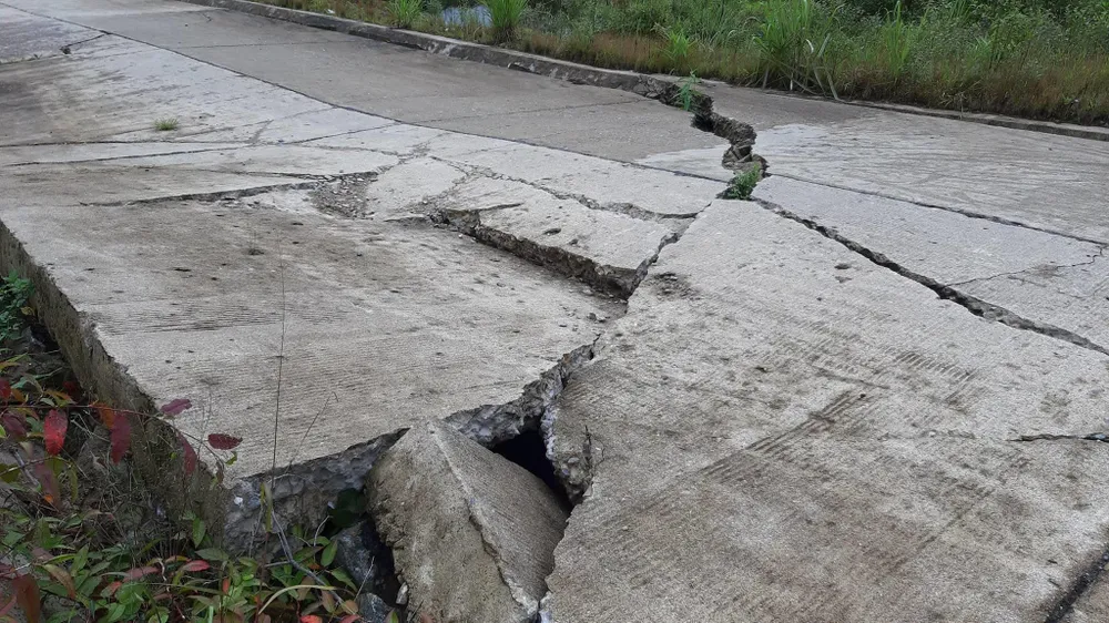 Một vị trí khác, một khối bê tông bị gãy, cong vênh lên khỏi mặt đường gần cả mét.