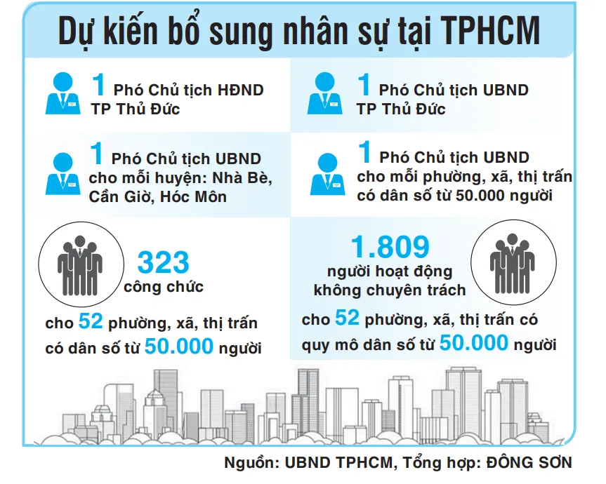 Từ Nghị quyết 80/NQ-HĐND, UBND TPHCM đã ban hành kế hoạch tăng phó chủ tịch đối với 52 phường, xã, thị trấn có dân số từ đủ 50.000 dân trở lên. Sở Nội vụ cũng tham mưu UBND TPHCM trình HĐND TPHCM giao bổ sung biên chế công chức làm việc tại phường năm 2023; giao số lượng cán bộ, công chức, người hoạt động không chuyên trách phường, xã, thị trấn năm 2024.