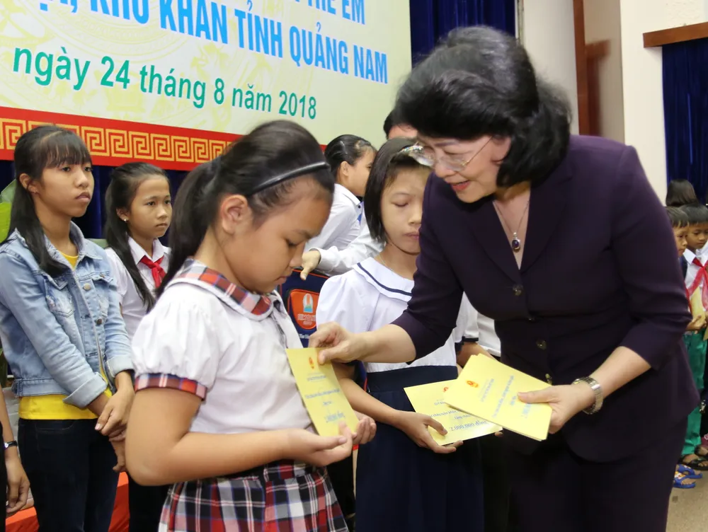 Sáng 24-8, tại thành phố Tam Kỳ (tỉnh Quảng Nam), Quỹ Bảo trợ trẻ em Việt Nam tổ chức chương trình tặng quà cho gia đình chính sách và trẻ em có hoàn cảnh đặc biệt, khó khăn của tỉnh Quảng Nam. Phó Chủ tịch nước Đặng Thị Ngọc Thịnh đến dự và trao quà.