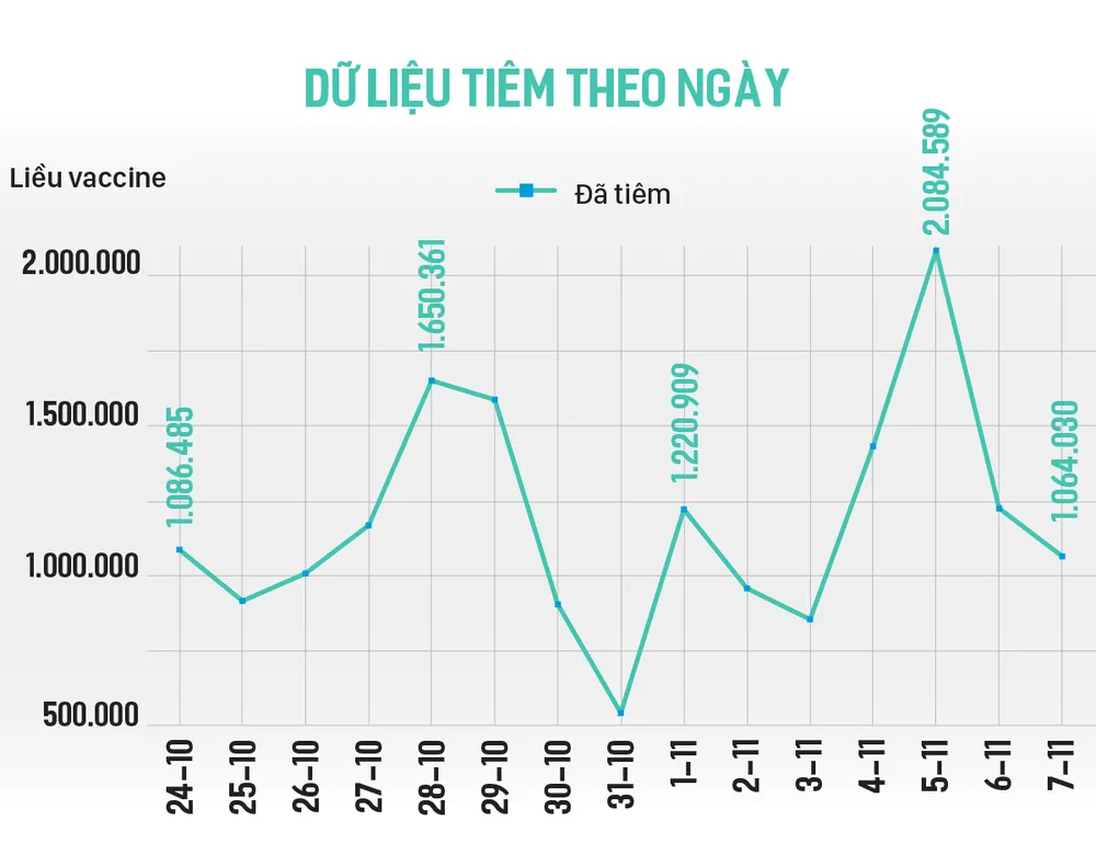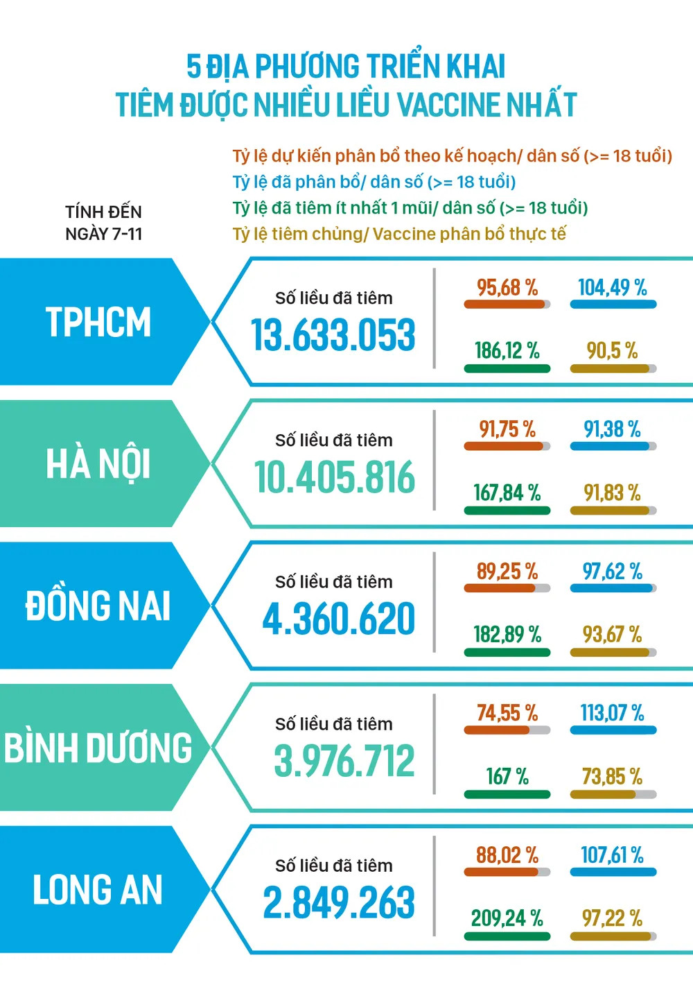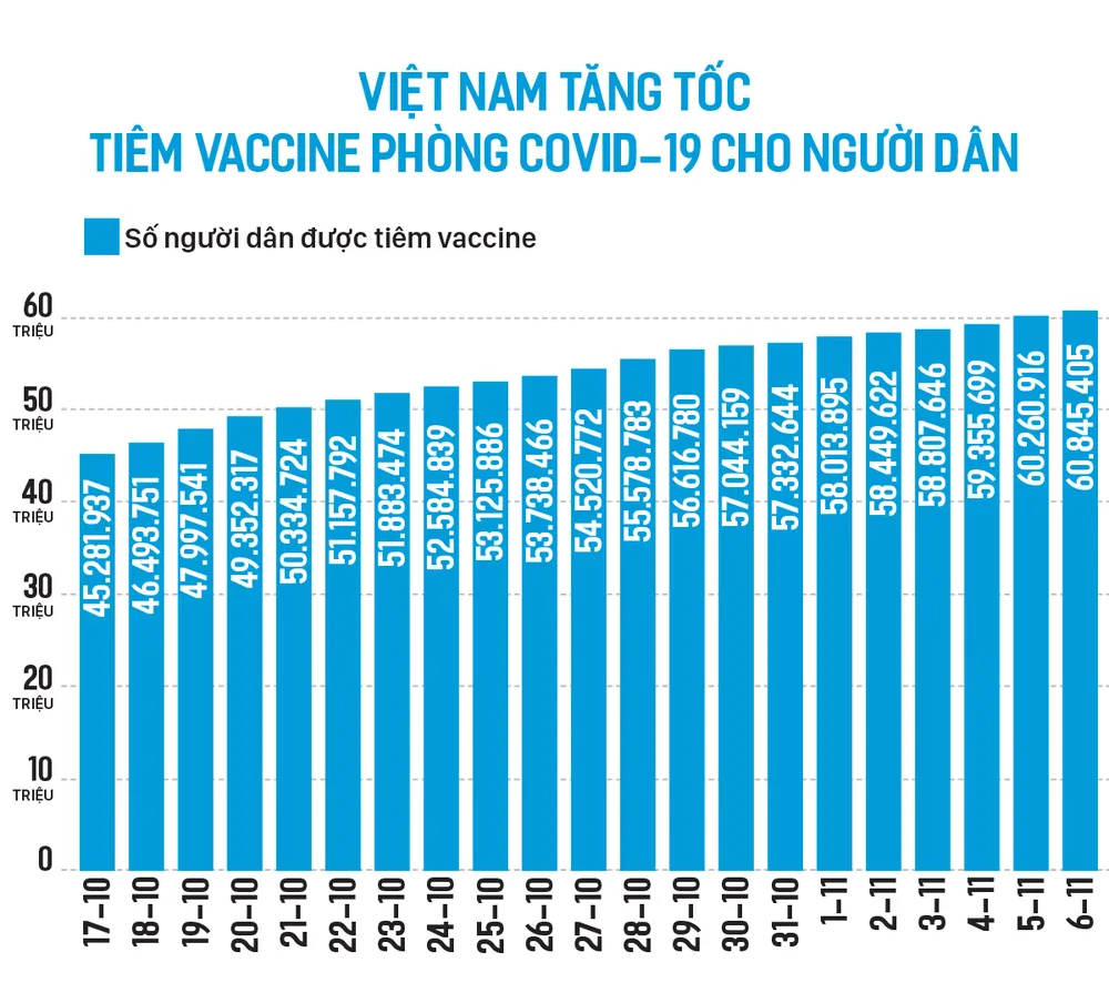 Trong thời gian gần đây, Việt Nam đã đẩy mạnh tiêm vaccine COVID-19 cho người dân. Tính đến 6-11-2021, đã có 60.845.405 người được tiêm ít nhất 1 liều vaccine phòng COVID-19, đạt tỷ lệ gần 62% dân số.