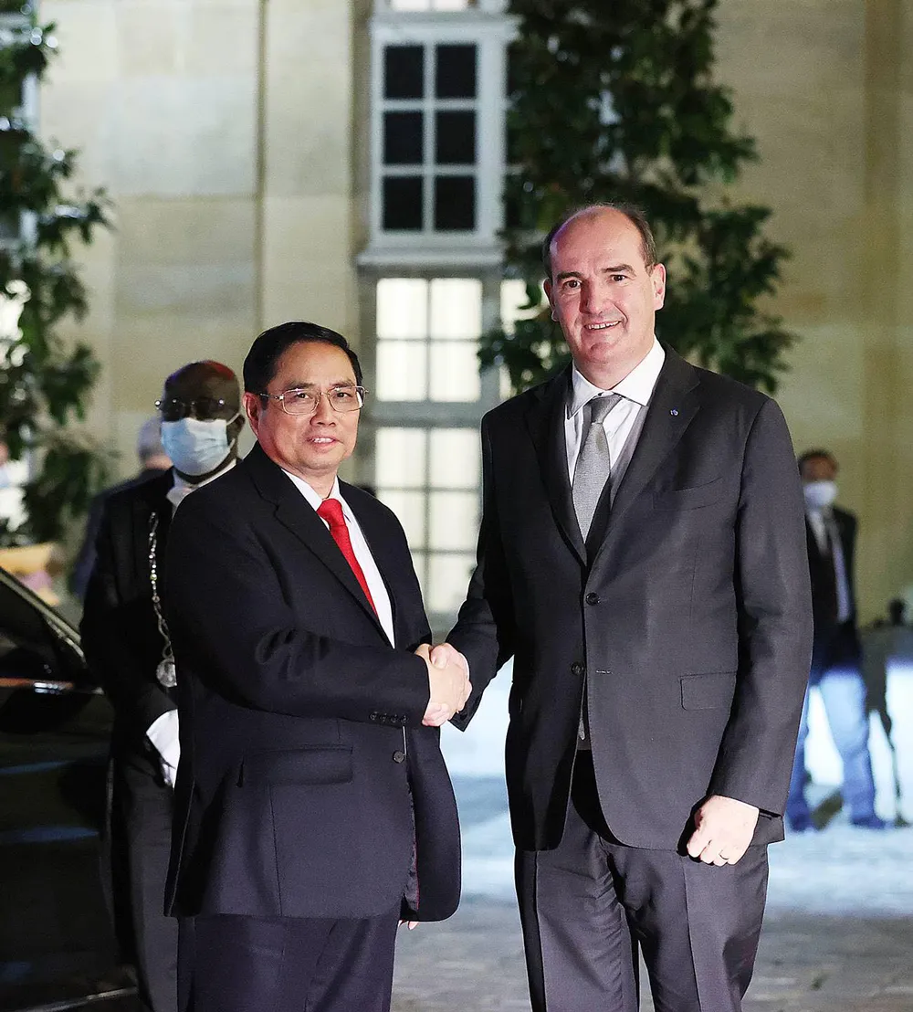 Thủ tướng Jean Castex bày tỏ vui mừng đón Thủ tướng Phạm Minh Chính sang thăm chính thức Cộng hòa Pháp, đánh giá cao quan hệ gắn bó giữa nhân dân hai nước và mức độ phát triển sâu rộng, đa dạng của quan hệ Đối tác chiến lược với Việt Nam trong thời gian qua. Thủ tướng Phạm Minh Chính cảm ơn sự đón tiếp trọng thị mà Chính phủ Pháp và cá nhân Ngài Thủ tướng đã dành cho Đoàn cấp cao Việt Nam; đánh giá cao vai trò và vị thế của Pháp trong Liên minh châu Âu cũng như trên trường quốc tế; nhấn mạnh tầm quan trọng của quan hệ với Pháp trong tổng thể chính sách đối ngoại của Việt Nam, mong muốn quan hệ Đối tác chiến lược Việt Nam - Pháp tiếp tục phát triển mạnh mẽ hơn nữa.