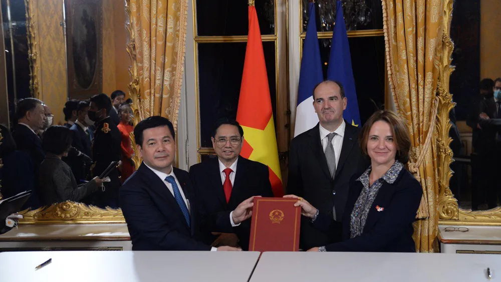 | Ngay sau đó, hai Thủ tướng đã chứng kiến Lễ ký kết một số văn bản, thỏa thuận hợp tác, hợp đồng kinh tế lớn, đáng chú ý có: Thỏa thuận hợp tác giữa Bộ Tư pháp Việt Nam và Tham Chính viện Pháp giai đoạn 2021-2026; Biên bản ghi nhớ hợp tác trong lĩnh vực vệ tinh, thành phố thông minh, nhận dạng kỹ thuật số và an ninh mạng giữa Tập đoàn bưu chính viễn thông Việt Nam và Tập đoàn Thales và các Biên bản ghi nhớ hợp tác của Vietjet Air, Bamboo Airway và Safran. |