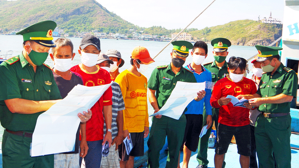 Bộ đội Biên phòng hướng dẫn ngư dân về Luật Thủy sản. Ảnh: NGỌC OAI