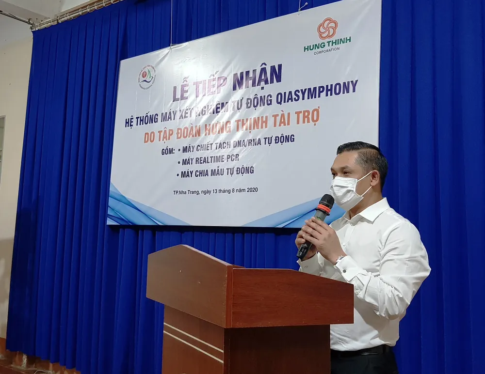 Tại buổi tiếp nhận, thay mặt lãnh đạo tỉnh, ông Nguyễn Tấn Tuân, Chủ tịch UBND tỉnh Khánh Hòa trân trọng và cảm kích trước tình cảm của Tập đoàn Hưng Thịnh dành cho địa phương Khánh Hòa và nhiều địa phương khác mà Tập đoàn đã hỗ trợ. Theo ông Nguyễn Tấn Tuân, dịch bệnh tại Khánh Hòa cũng diễn biến phức tạp, nhất là địa phương đang tiếp nhận cả ngàn người dân từ các nước về đây cách ly, nên số lượng mẫu xét nghiệm Covid-19 rất lớn. Trong khi đó, hiện địa phương đang khó khăn do không chủ động được máy xét nghiệm, ảnh hưởng đến thời gian cho kết quả xét nghiệm Covid-19 và công tác chống dịch nói chung.
