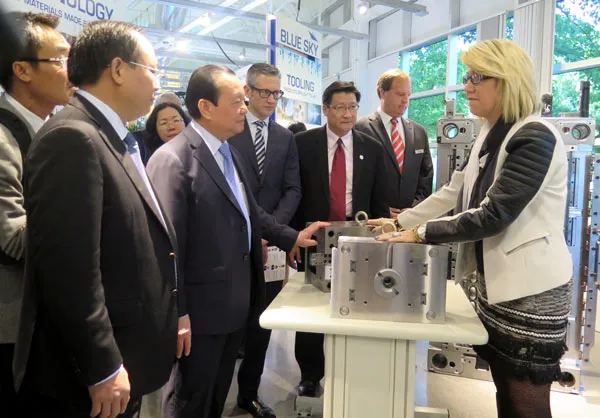 Bí thư Thành ủy TPHCM Lê Thanh Hải và đại diện lãnh đạo Tập đoàn Jabil (thứ 2 và 3 từ trái sang) tham quan các sản phẩm của Tập đoàn.   Ảnh: Hồng Hiệp