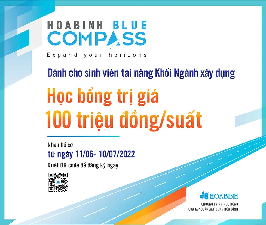 Nhằm tạo cầu nối việc làm giữa doanh nghiệp với nguồn nhân lực trẻ và khuyến khích, nâng cao tinh thần học tập của các bạn sinh viên, Tập đoàn Xây dựng Hòa Bình triển khai chương trình Học bổng đặc biệt Hòa Bình Blue Compass – Học bổng La bàn Xanh với thông điệp “Khai phóng chân trời mới” dành cho 20 bạn sinh viên năm 3 lên năm 4 thuộc các khối ngành xây dựng tại các trường đại học trong cả nước, giá trị học bổng lên đến 100 triệu đồng/ suất.