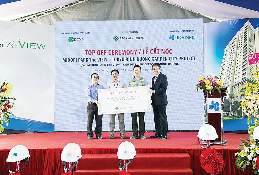 Sáng 10-6-2019, Tập đoàn Xây dựng Hòa Bình và Becamex Tokyu đã tiến hành cất nóc công trình Midori Park The View, đảm bảo yêu cầu chất lượng, an toàn đã cam kết và vượt tiến độ 13 ngày.