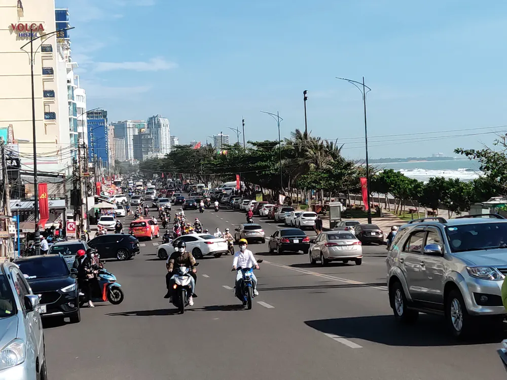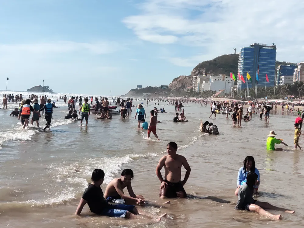 Ghi nhận tại khu vực Bãi Sau, đông đảo du khách dạo chơi, tắm biển trong ngày đầu năm. Do lượng khách đông nên các tuyến đường Trần Phú, Thùy Vân, đường lên Ngọn Hải đăng có thời điểm bị ùn ứ cục bộ.