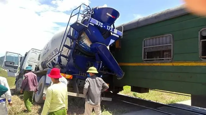 Cú tông mạnh, bất ngờ đã khiến đầu xe bồn bị hư hỏng nặng, xe bị đẩy xoay dọc theo đường ray. Vụ tai nạn đã làm tài xế xe bồn bị thương.