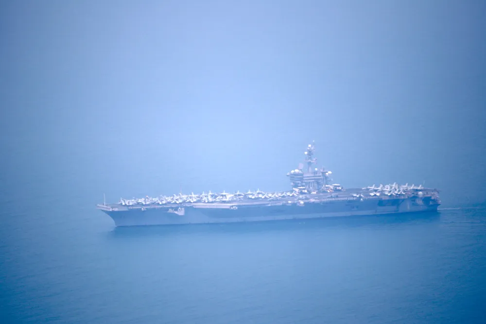 Tàu sân bay USS Carl Vinson chở rất nhiều máy bay trên boong đang tiến vào vịnh Đà Nẵng