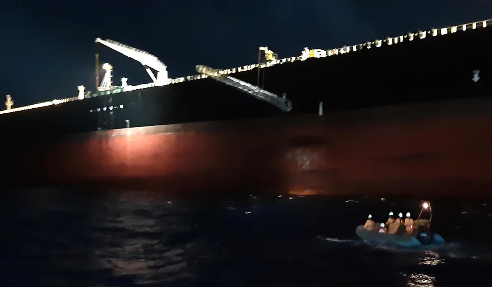 Các nhân viên cứu nạn hàng hải Việt Nam tiếp cận tàu Maran Taurus bằng xuồng cao su để cứu nạn thuyền viên Michael Samorin