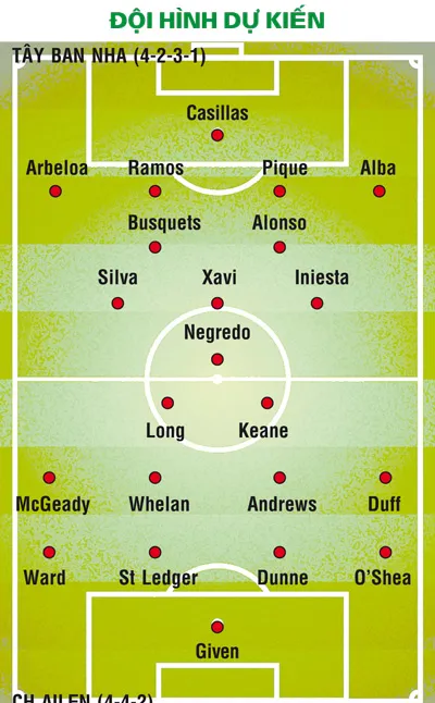 CH Ailen không thể dựng chiếc xe buýt 3 tầng trước khung thành để rồi chẳng biết phải làm gì ngoài việc chịu trận. Chỉ 1 trong 15 bàn thắng gần nhất tại các kỳ EURO đến từ tính huống cố định, điều đó cũng khẳng định Tây Ban Nha chẳng cần thêm những phương án phụ để khoan thủng tuyến phòng ngự của bất kỳ đối thủ nào. Trước CH Ailen đêm nay, câu hỏi chỉ là bao giờ Tây Ban Nha ghi bàn mà thôi!