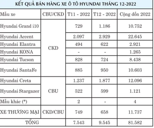 Hyundai Accent là mẫu xe có số lượng bán hàng tốt nhất tháng 12 với 2.929 xe đến tay khách hàng, tăng trưởng 39,6% so với tháng 11, qua đó cũng là mẫu bán chạy nhất của Hyundai trong năm 2022 với tổng số 22.645 xe. Hyundai Creta tiếp tục giữ vững phong độ với 1.877 xe bán ra trong tháng, tăng trưởng 51,7% so với tháng 11, đưa tổng doanh số trong năm 2022 đạt 12.096 xe, đứng ở vị trí thứ 2 về số bán của các mẫu xe Hyundai trong năm 2022. Hyundai Grand i10 đứng ở vị trí thứ 3 với 1.186 xe bán ra trong tháng 12, tăng trưởng 62,7% so với tháng 11 và cộng dồn 10.752 xe trong năm 2022.