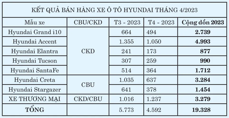 Hyundai Accent tiếp tục là mẫu xe có số lượng bán hàng tốt nhất tháng 4 với 1.050 xe đến tay khách hàng. Hyundai Creta, đứng ở vị trí thứ 2 với 637 xe bán ra, ngoài ra từ tháng 4-2023, Hyundai Creta cũng được chính thức sản xuất lắp ráp tại Việt Nam.