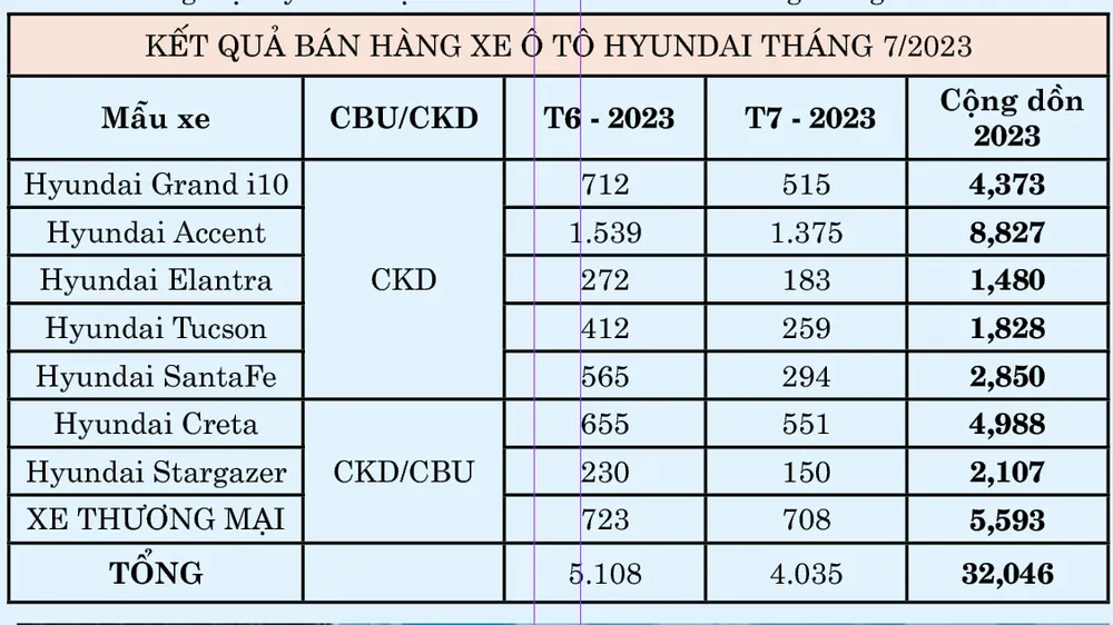 Accent tiếp tục là mẫu xe có số lượng bán hàng tốt nhất tháng 7 với 1.375 xe đến tay khách hàng. Hyundai Creta và Hyundai Grand i10 lần lượt đứng ở vị trí thứ 2 và thứ 3 với số bán hàng đạt 551 và 515 xe. Hyundai Santa Fe đứng thứ 4 với số bán đạt 294 xe. Hyundai Tucson với 259 xe bán ra, đứng ở vị trí thứ 5. Hyundai Elantra đứng thứ 6 với 183 xe bán ra. Hyundai Stargazer khép lại tháng 6 với số bán đạt 150 xe. Các mẫu xe thương mại Hyundai đạt doanh số 708 xe bán ra trong tháng 7-2023.