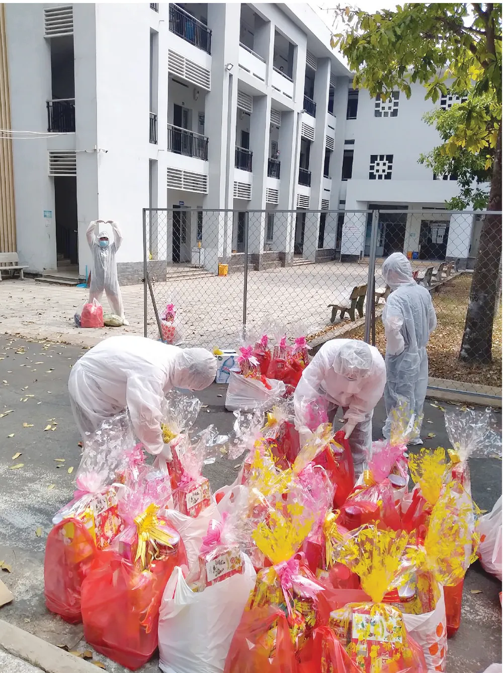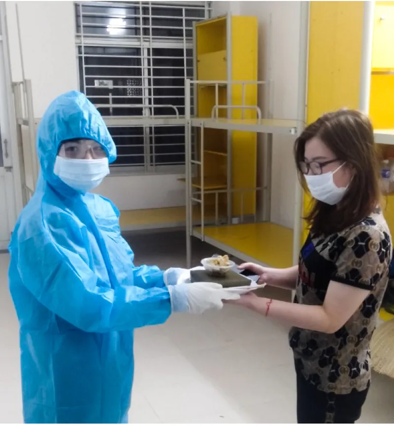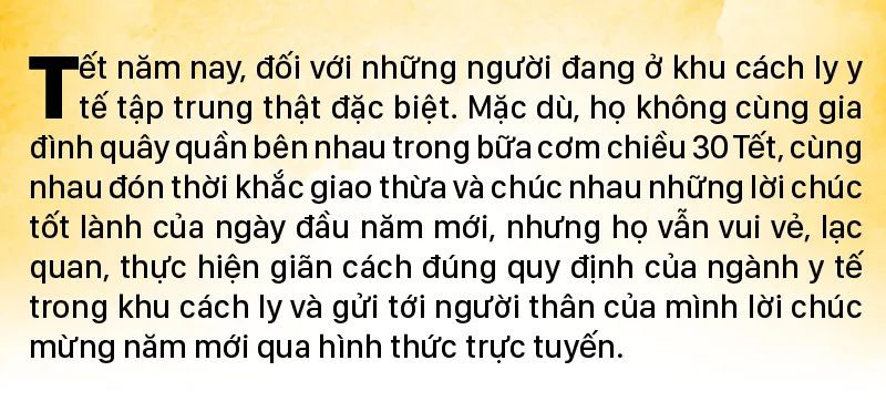 Không chỉ những người thực hiện cách ly mà cả các nhân viên y tế ở đây cũng phải đón tết xa nhà. Tại Bệnh viện Bệnh lý hô hấp cấp tính Củ Chi, công việc hàng ngày của nhân viên y tế là kiểm tra sức khỏe của mọi người, đo thân nhiệt và phục vụ các hoạt động của người cách ly, tiếp nhận hàng hóa từ bên ngoài gửi vào theo đúng quy định. Họ cũng không được về nhà ăn tết. Sau đợt phục vụ cách ly, họ sẽ tiếp tục tự cách ly tại nhà 14 ngày. Chị Nguyễn Thị Phương Trang, công tác ở Bệnh viện Ung bướu TPHCM, cho biết, cảm giác đón tết ở một nơi xa lạ, xa gia đình tuy có buồn nhưng vì nhiệm vụ phải cố gắng. “Đón tết xa nhà, buồn lắm chứ, người ở lại buồn, người ra đi cũng rưng rưng nước mắt. Khi chị nói, tết này không về, đứa con gái của chị nó khóc đòi mẹ, nhưng vì công việc, chị cũng ráng động viên bé. Để bé luôn có cảm giác mẹ bên cạnh, hàng ngày chị đều gọi điện về hỏi thăm con. Tết ở đây thật đặc biệt, nhưng sẽ thật đáng nhớ, khi về chị sẽ kể cho con gái mình nghe về những ngày khó quên nơi đây”, chị Trang tâm sự.