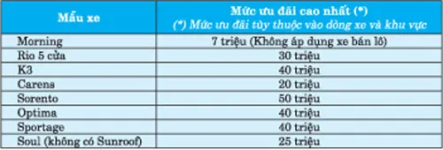 Ngoài ra, dịp này Thaco Kia triển khai chương trình ưu đãi đặc biệt cuối năm với nhiều chương trình quà tặng, phiếu ưu đãi dịch vụ phụ tùng và mức ưu đãi giá lên đến 50 triệu đồng. Chương trình bắt đầu từ ngày 1-12 đến 31-12-2014 và áp dụng theo từng dòng xe và khu vực cụ thể.