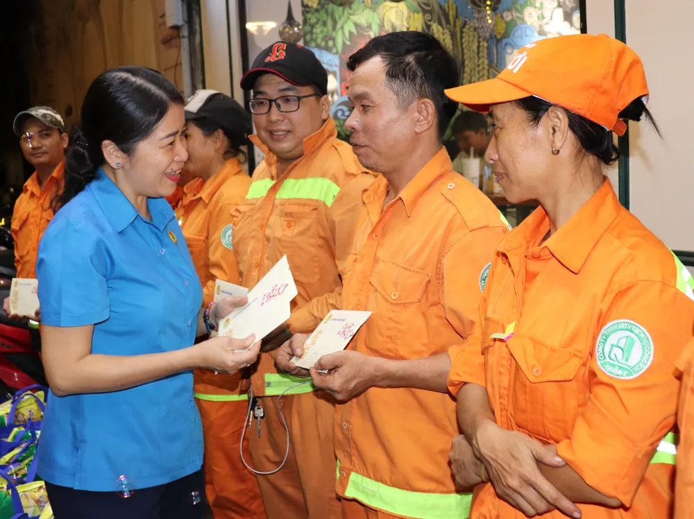 Đại diện LĐLĐ quận 5 cũng trao quà và lì xì đến anh chị em công nhân đang làm công tác vệ sinh tại các công viên và gần 100 tuyến đường tại quận 5.