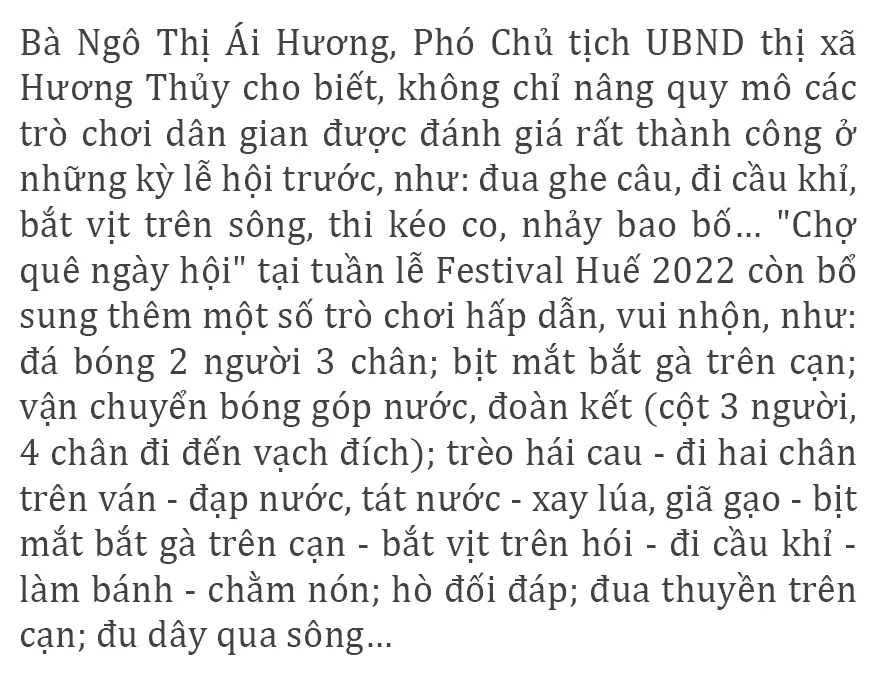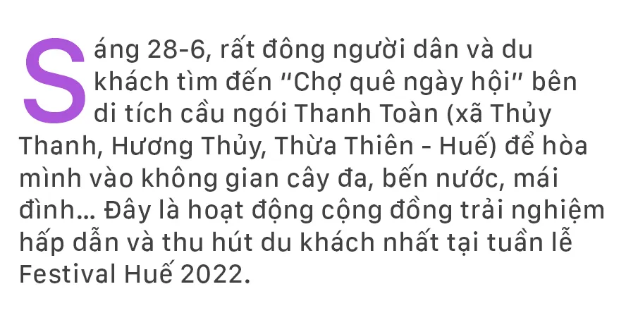 Sáng 28-6, rất đông người dân và du khách tìm đến “Chợ quê ngày hội” bên di tích cầu ngói Thanh Toàn (xã Thủy Thanh, Hương Thủy, Thừa Thiên - Huế) để hòa mình vào không gian cây đa, bến nước, mái đình… Đây là hoạt động cộng đồng trải nghiệm hấp dẫn và thu hút du khách nhất tại tuần lễ Festival Huế 2022.