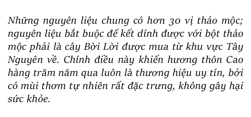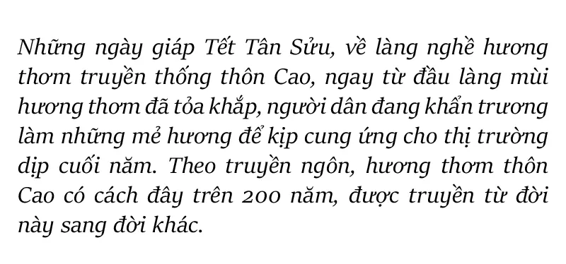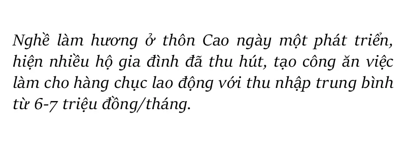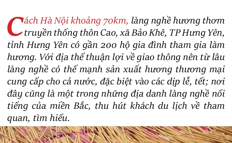 Cách Hà Nội khoảng 70km, làng nghề hương thơm truyền thống thôn Cao, xã Bảo Khê, TP Hưng Yên, tỉnh Hưng Yên có gần 200 hộ gia đình tham gia làm hương. Với địa thế thuận lợi về giao thông nên từ lâu làng nghề có thế mạnh sản xuất hương thương mại cung cấp cho cả nước, đặc biệt vào các dịp lễ, tết; nơi đây cũng là một trong những địa danh làng nghề nổi tiếng của miền Bắc, thu hút khách du lịch về tham quan, tìm hiểu.
