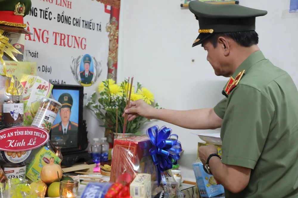 Đoàn công tác đã đến thắp hương, thăm hỏi, động viên gia đình các liệt sĩ hy sinh khi làm nhiệm vụ tại xã Ea Tiêu và xã Ea Ktur (huyện Cư Kuin, tỉnh Đắk Lắk). Ảnh: NGUYỄN TRANG |