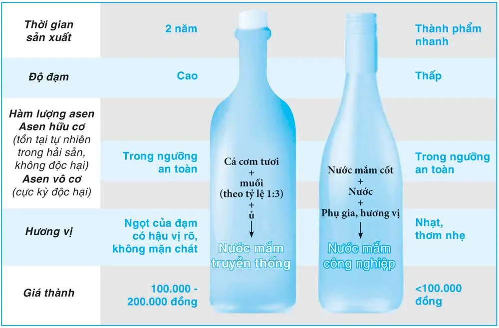 Là chủ cơ sở sản xuất nước mắm Quang Hải có sản lượng tới 850.000 lít/năm - nhiều nhất trong số các cơ sở tư nhân sản xuất nước mắm ở Cát Hải, Hải Phòng, ông Bùi Đức Vinh chia sẻ: Nước mắm công nghiệp chủ yếu là mua nước mắm loại chất lượng thấp của cơ sở thủ công sản xuất, sau đó về pha chế hương liệu, làm loãng ra nên có độ đạm thấp, nhạt hơn, giá thành rẻ hơn. Nhiều cơ sở thủ công không có đủ tiềm lực tài chính, năng lực tiếp thị để cạnh tranh với nước mắm công nghiệp, nên khi sản phẩm làm ra dù chất lượng rất cao nhưng vẫn khó chiếm lĩnh được thị trường.
