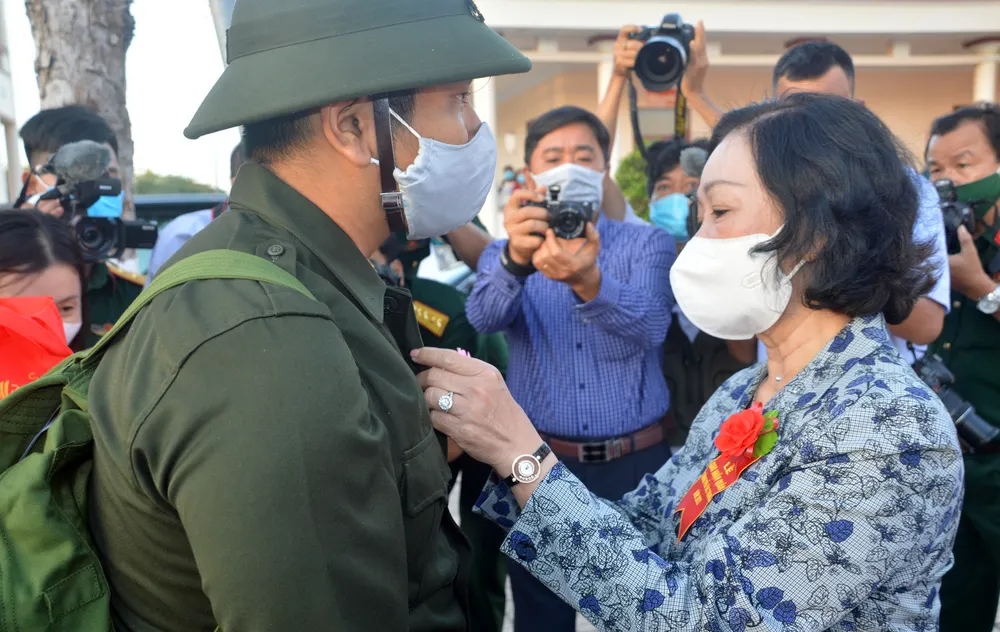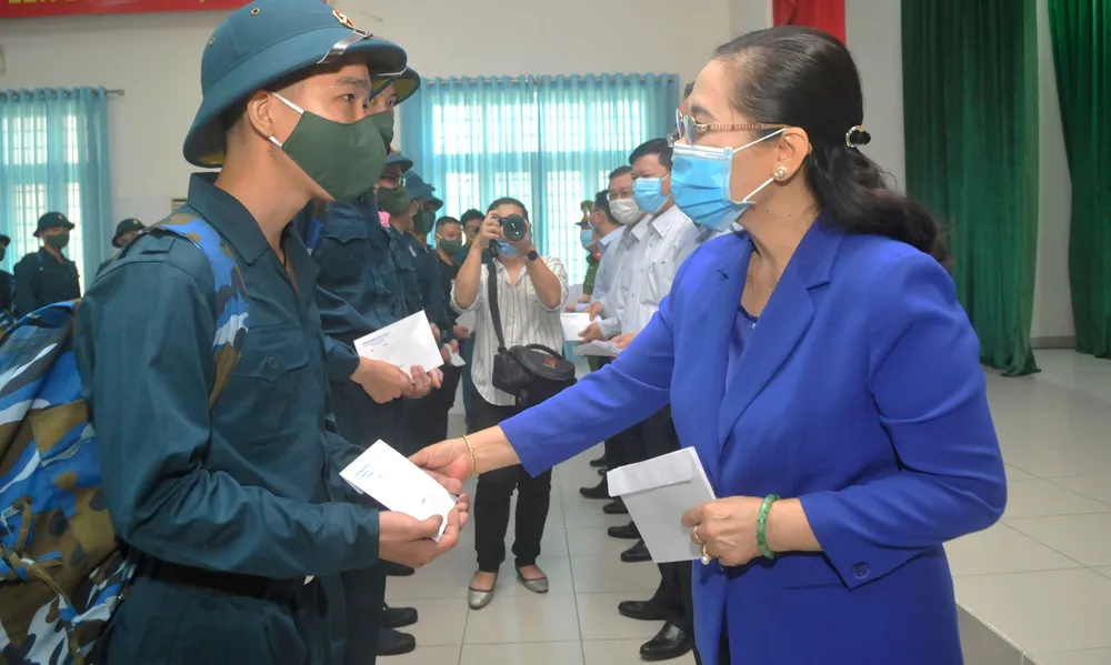 Trưởng Ban Tuyên giáo Thành ủy TPHCM Phan Nguyễn Như Khuê chúc mừng thanh niên lên đường nhập ngũ