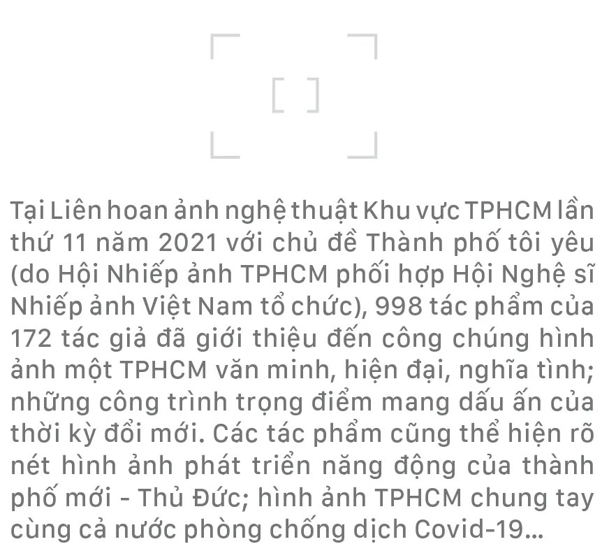 Tại Liên hoan ảnh nghệ thuật Khu vực TPHCM lần thứ 11 năm 2021 với chủ đề Thành phố tôi yêu (do Hội Nhiếp ảnh TPHCM phối hợp Hội Nghệ sĩ Nhiếp ảnh Việt Nam tổ chức), 998 tác phẩm của 172 tác giả đã giới thiệu đến công chúng hình ảnh một TPHCM văn minh, hiện đại, nghĩa tình; những công trình trọng điểm mang dấu ấn của thời kỳ đổi mới.
