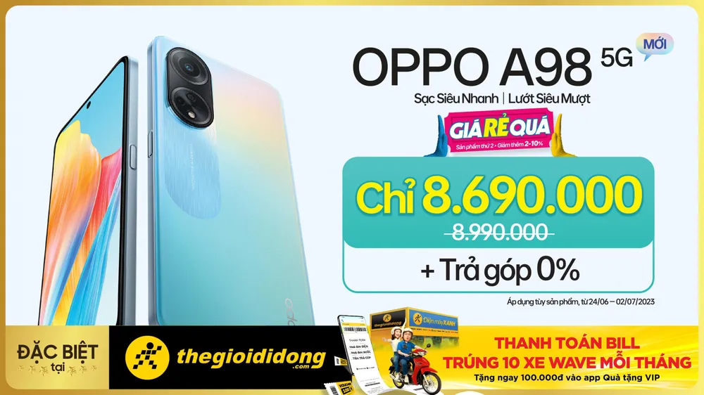 Theo đó, OPPO A98 được mở bán duy nhất tại hai hệ thống Thế Giới Động và Điện máy Xanh trên toàn quốc với mức giá 8,99 triệu đồng cùng nhiều ưu đãi hấp dẫn.