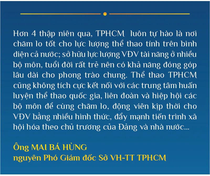 Dù vậy, với truyền thống của mình, có thể nói thể thao TPHCM vẫn có hướng đi riêng, giữ được vai trò của mình trong sự phát triển của thể thao nước nhà qua thành tích các kỳ SEA Games, mà mới nhất là ở SEA Games 31, thể thao TPHCM đã có kỳ đại hội thành công nhất, vượt 300% chỉ tiêu huy chương đề ra, là đoàn đóng góp nhiều huy chương nhất chỉ sau Hà Nội. Đó là thành quả của tinh thần tiên phong, vượt khó và luôn sẵn sàng nhận nhiệm vụ với thể thao cả nước.