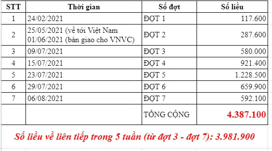 Như vậy, liên tiếp trong 5 tuần, 3.981.900 liều vaccine Covid-19 của AstraZeneca trong hợp đồng đặt mua 30 triệu liều của Hệ thống tiêm chủng VNVC đã về đến Việt Nam, nâng tổng số vaccine của Hợp đồng này đã có mặt tại Việt Nam lên 4.387.100 liều, tương đương khoảng 37% tổng lượng vaccine Covid-19 của AstraZeneca trong nước.