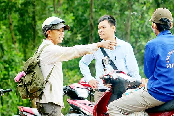 Theo sau xe anh Hoàng Thanh Lâm, Trưởng Công an xã Cam Tuyền, chạy dọc theo con đường hầm hố hun hút luồn vào rừng, bánh xe chúng tôi không “ăn đất” nên cứ trợt lên trợt xuống mãi. Đến điểm hẹn, anh Lâm dặn dò: “Các anh đợi ở đây, lát nữa sẽ có người ra đón vào vùng đặt bẫy. Nhớ là đừng tự ý vào rừng kẻo bị trâu tấn công. Do thời hạn bắt trâu chỉ còn vài ngày nữa nên anh em trong nhóm thợ săn rất căng thẳng và hơi kín lời, vì vậy các anh cũng không nên hỏi nhiều”. Đợi khoảng 30 phút thì một người đàn ông trạc 55 tuổi bất ngờ xuất hiện sau khoảnh rừng rậm khiến chúng tôi giật mình. Đó là ông Lê Minh, trưởng nhóm thợ săn, ngụ tại thị trấn Ái Tử (Triệu Phong, Quảng Trị). Không nói gì nhiều, ông Minh ra hiệu cho chúng tôi đi theo.