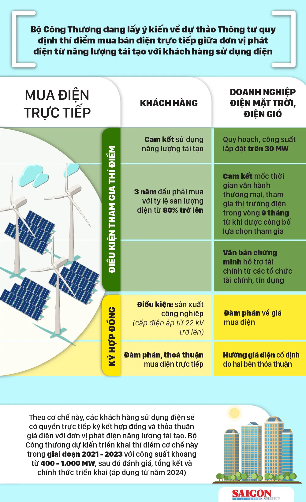 Bộ Công Thương đang lấy ý kiến về dự thảo Thông tư quy định thí điểm mua bán điện trực tiếp giữa đơn vị phát điện từ năng lượng tái tạo với khách hàng sử dụng điện