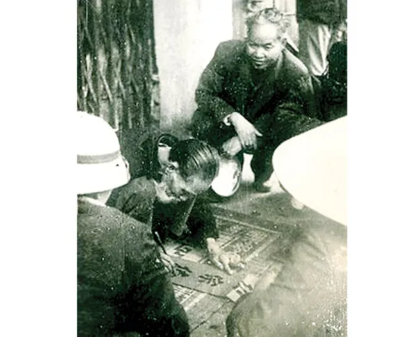Thi sĩ Vũ Đình Liên ngồi xem một ông đồ viết thư pháp ở Hà Nội. Ảnh: TL